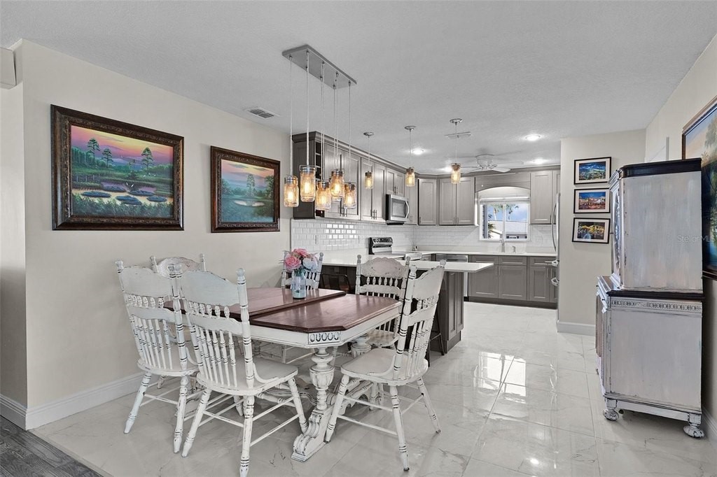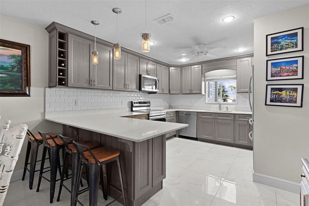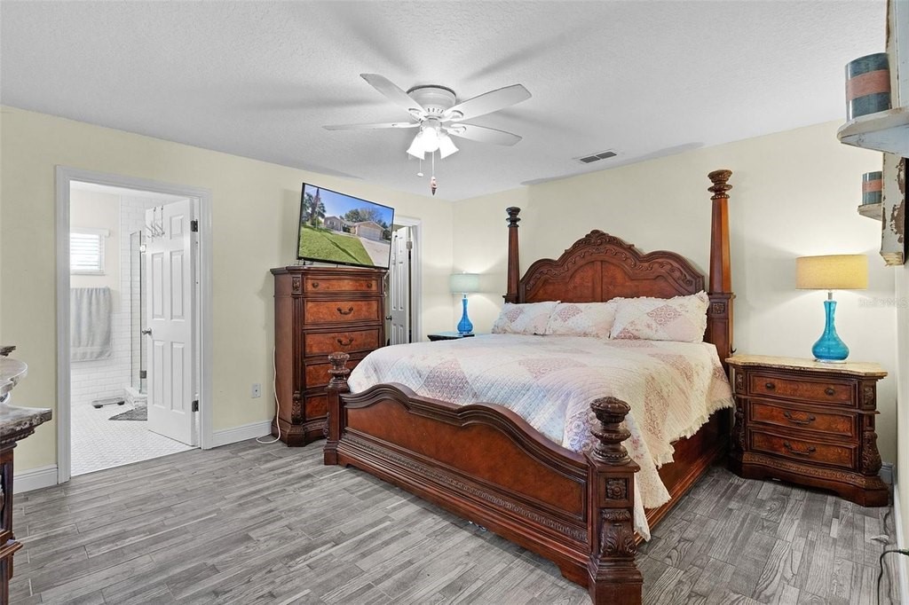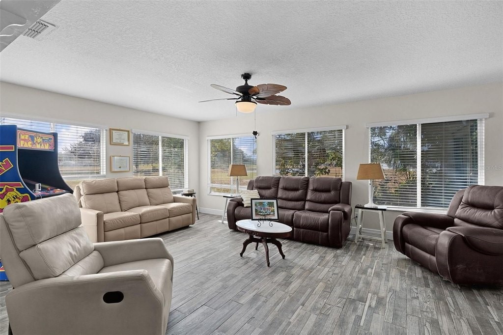 "Magnificent" hardly captures the breathtaking golf and water views showcased by this gorgeously updated home, set on a secluded cul-de-sac. Designed for both comfort and entertaining, the home features quartz countertops in the kitchen and both baths, upgraded appliances, and plank-style tile flooring throughout-with the exception of one guest bedroom for added comfort. The massive, extended living area is a true showstopper, perfectly positioned to take in sweeping views of the golf course. With three spacious bedrooms, ample closet space, double vanities in the primary bath, soft-close drawers, and a full two-car garage, this home checks every box. Step outside to enjoy a fenced yard with a charming gazebo, plus a cozy seating area ideal for relaxing evenings-or watching nearby rocket launches light up the sky. There is even a little piece of history moments from your back door. And no popcorn ceilings to be seen anywhere! Roof - 2017 HVAC - 2023 Located in the sought-after Spruce Creek South community, you're just minutes from the dining, shopping, and entertainment of Spanish Springs in The Villages, while enjoying an incredible array of amenities right at home. This gated, golf-cart-friendly community offers an 18-hole golf course, a 25,000-square-foot clubhouse, fitness center, ballroom, library, hobby and game rooms, The Links restaurant, and an impressive lineup of activities including pickleball, tennis, bocce, volleyball, basketball, a pool and spa, softball and horseshoe teams, water aerobics, dance clubs, and so much more. This is more than a home-this is the lifestyle you deserve.